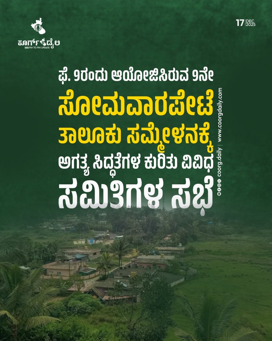 ಫೆ. 9ರಂದು ಆಯೋಜಿಸಿರುವ 9ನೇ ಸೋಮವಾರಪೇಟೆ ತಾಲೂಕು ಸಮ್ಮೇಳನಕ್ಕೆ ಅಗತ್ಯ ಸಿದ್ಧತೆಗಳ ಕುರಿತು ವಿವಿಧ ಸಮಿತಿಗಳ ಸಭೆ