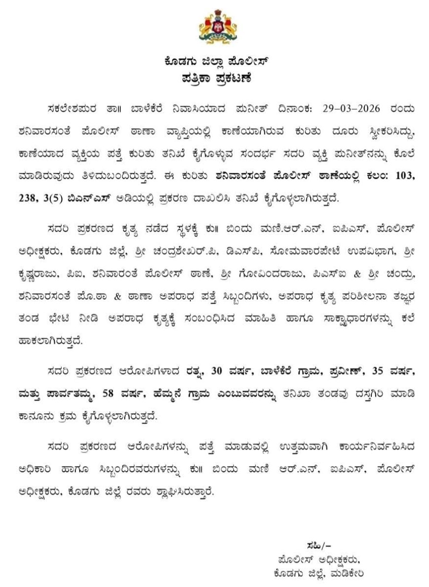 ಶನಿವಾರಸಂತೆ;,ಸಕಲೇಶಪುರ ತಾಲೂಕಿನ ಬಾಳೆಕೆರೆ ನಿವಾಸಿಯಾದ ಪುನೀತ್ ದಿನಾಂಕ: 29-03-2026 ರಂದು ಶನಿವಾರಸಂತೆ ಪೊಲೀಸ್ ಠಾಣಾ ವ್ಯಾಪ್ತಿಯಲ್ಲಿ ಕಾಣೆಯಾಗಿರುವ ಕುರಿತು ದೂರು ಸ್ವೀಕರಿಸಿದ್ದು, ಕಾಣೆಯಾದ ವ್ಯಕ್ತಿಯ ಪತ್ತೆ ಕುರಿತು ತನಿಖೆ ಕೈಗೊಳ್ಳುವ ಸಂದರ್ಭ ಸದರಿ ವ್ಯಕ್ತಿ ಪುನೀತ್ನನ್ನು ಕೊಲೆ ಮಾಡಿರುವುದು ತಿಳಿದುಬಂದಿರುತ್ತದೆ.